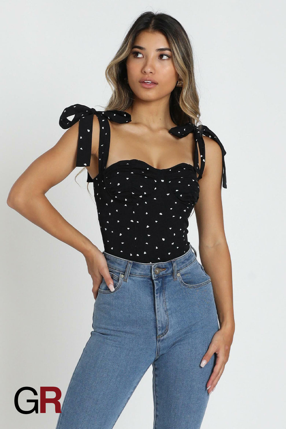 A sweetheart corset top sprinkled with white micro-dots and finished with bow-tied shoulder straps. Light ruching at the bust and a nipped waist deliver a playful, pin-up line.
