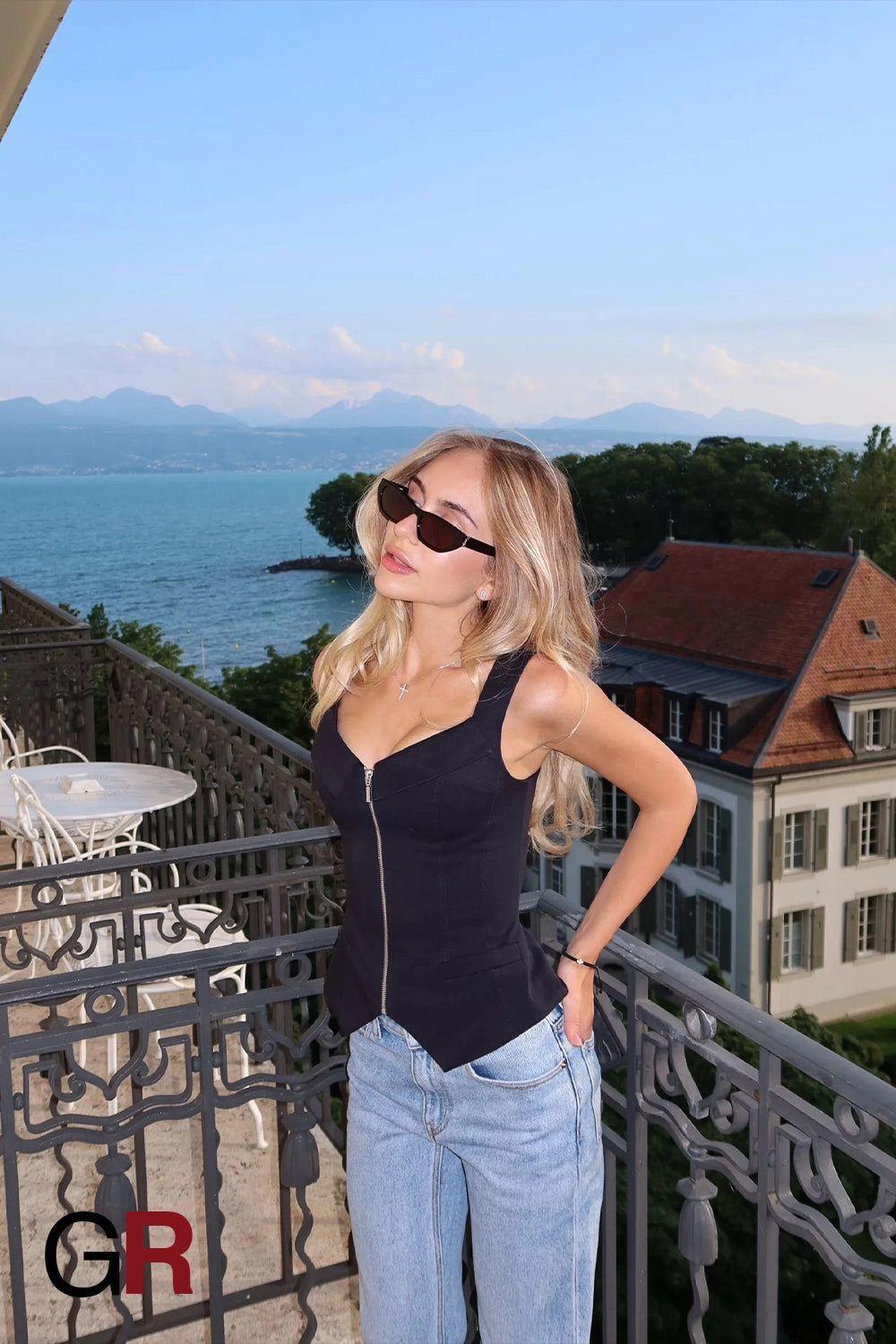 A sculpting zip-front top with corset seaming and wide straps—sharp neckline, nipped waist, and an easy zip for on/off. Modern structure with after-dark polish.