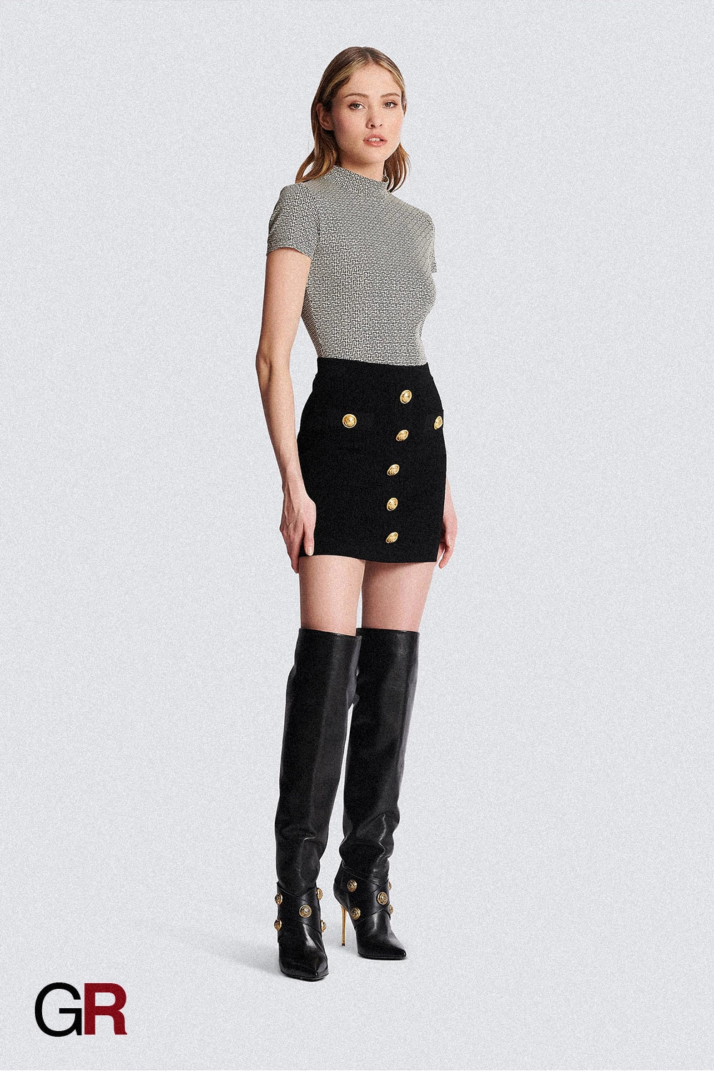 A sculpted knit mini with a body-contouring silhouette and a regal row of ornate gold medallion buttons. The high-rise waist and clean, tailored lines create a polished finish—modern glamour with an old-world touch.