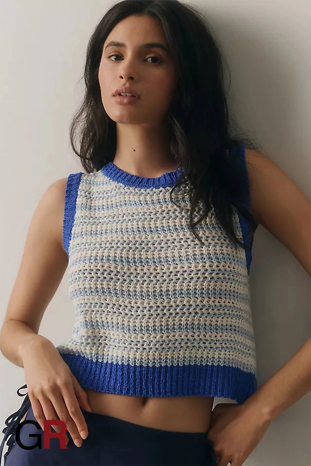 Breezy polish for warm days. An airy, open-stitch sleeveless knit in nautical cream-and-blue stripes, finished with contrast rib trims and elegant back ties. Cropped ease with a flattering, straight hem—casual yet unmistakably refined.