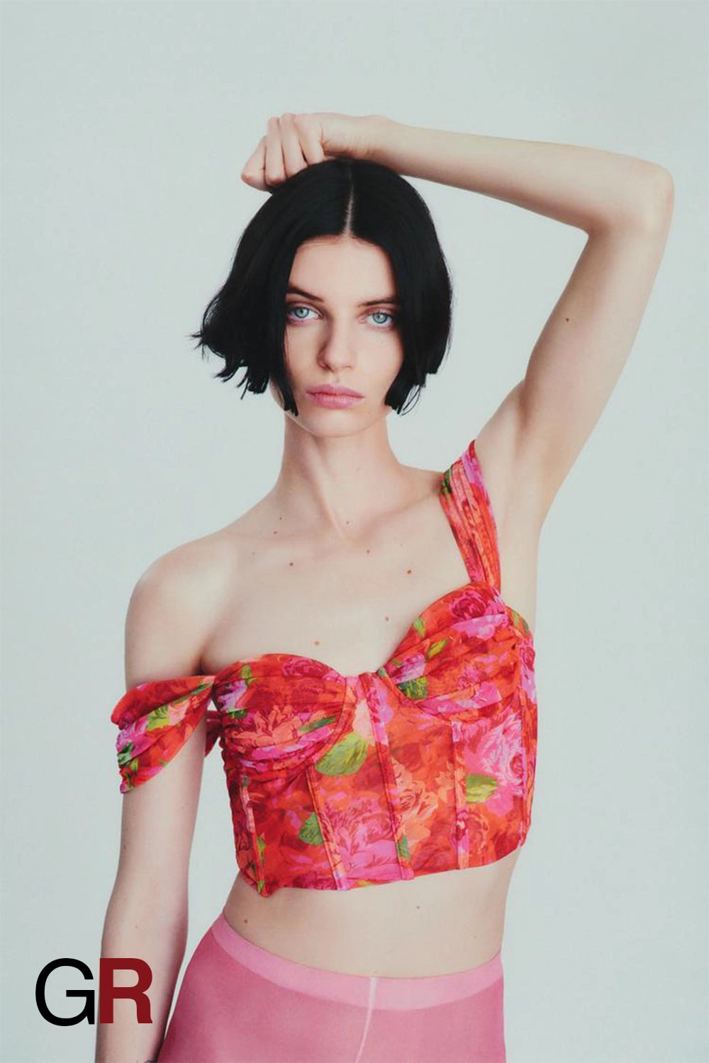 A vivid floral corset with an asymmetric, off-shoulder strap and sculpted cups. Boned seaming defines the waist while the cropped length balances volume. Playful color, couture lines, instant spotlight.