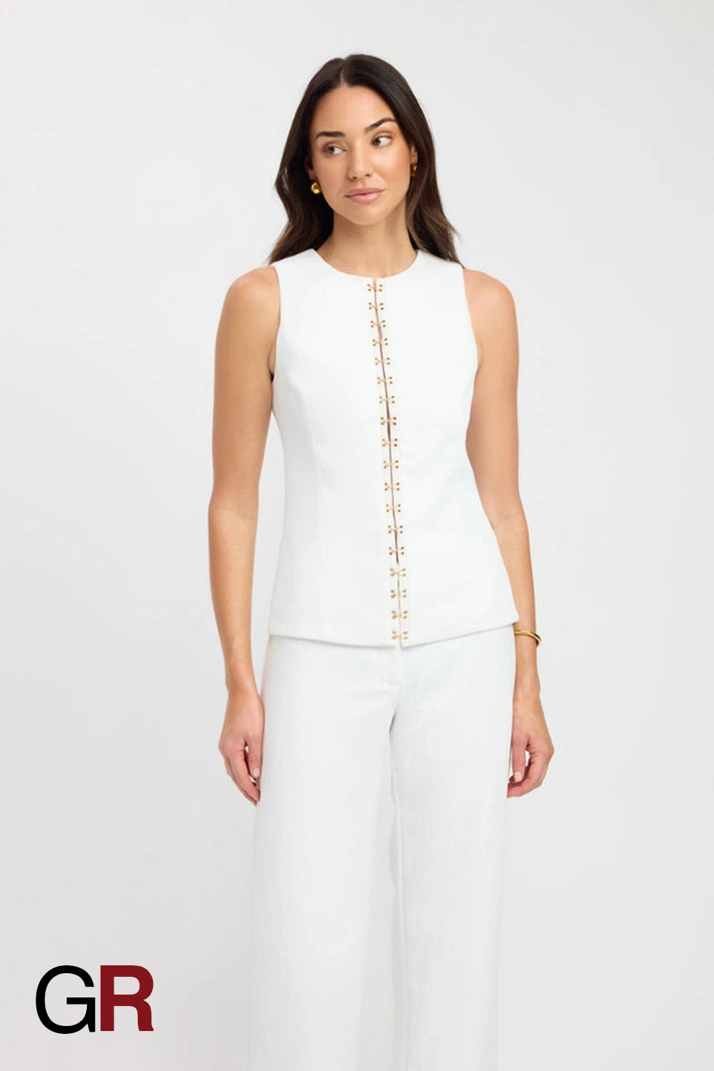 A tailored knit shell with a clean crew neckline and a column of gilded hook-and-eye closures. Sculpted through the waist for a sleek, suit-ready line—quietly luxe, endlessly polished.