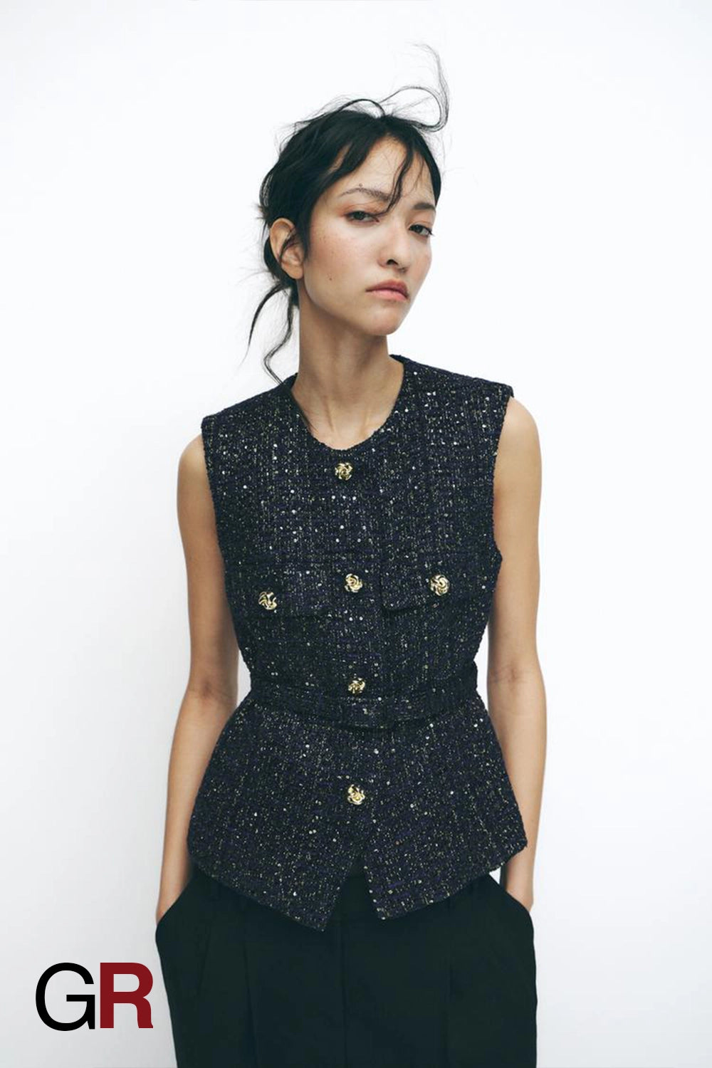 A couture-leaning sleeveless vest in midnight bouclé, finished with crest buttons, petite flap pockets, and a subtle peplum for waist definition. Quietly luxe, instantly tailored.